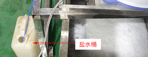 2、加鹽水:標(biāo)準(zhǔn)25公斤鹽水桶加鹽,1噸及以下型號(hào)制冰機(jī)加鹽300克;1.5噸