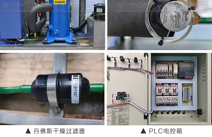4.采用一線品牌制冷配件:德國比澤爾、丹麥丹佛斯、美國谷輪、臺灣漢鐘壓縮機、意大利萊富康等知名壓縮機,丹佛斯電磁閥、膨脹閥、干燥過濾器、美國愛默生膨脹閥等制冷配件,片冰機質量可靠,故障率低,制冰效率高。